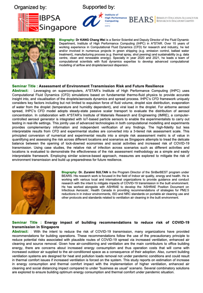 In this seminar, Dr. KANG Chang Wei from IHPC, A*STAR and Dr. Zuraimi SULTAN from BEARS are cordially invited by IBPSA Singapore to share their recent research activities related to the pandemic. Dr. KANG will first present their R&D efforts in Assessment of Environment Transmission Risk and Future Resilience. After that, Dr. Zuraimi will elucidate Energy impact of building recommendations to reduce risk of COVID-19 transmission in Singapore. Building practitioners, policy makers, ESD consultants, architects and planners, as well as researchers and students who are interested in relevant topics, are all welcomed to participate in this seminar.