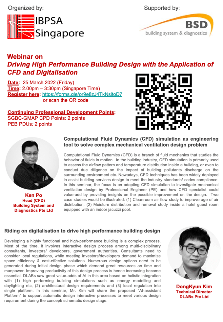 Digitalization is a major force propelling today’s world forward. Modeling and digital services are enabling and transforming buildings into smart, efficient, sustainable, safe, and comfortable environments. In this webinar, two local experts have been invited to share their leading efforts and viewpoints about the application of CFD simulations and digitalization service towards high performance building design. Mr. Ken PO, Head for CFD team from Building System and Diagnostics Pte Ltd, will demonstrate how CFD is effectively used as “value-add” engineering tool to improve the design of complex mechanical ventilation system. Mr. DongKyun KIM, Technical Director of DLABs Pte Ltd, will then present and share their “AI-assistant Platform” for supporting automatic design interactive processes to meet various design requirement during the concept/ schematic design stage.