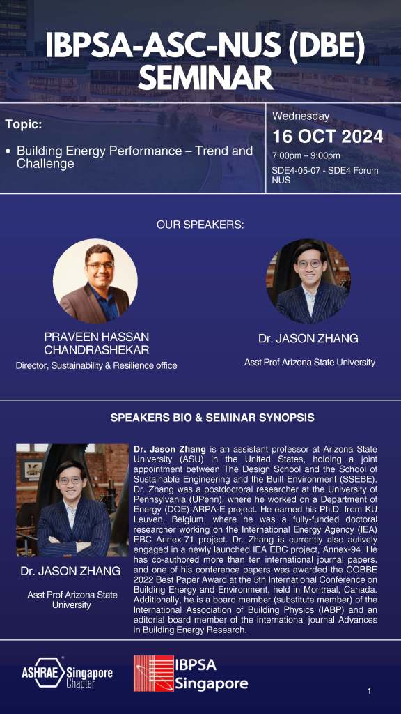We are delighted to share that on October 16, 2024, from 7:00 to 9:00 PM, IBPSA Singapore, in collaboration with ASC and NUS, hosted an insightful seminar titled “Building Energy Performance – Trend and Challenge” at SDE4-05-07.