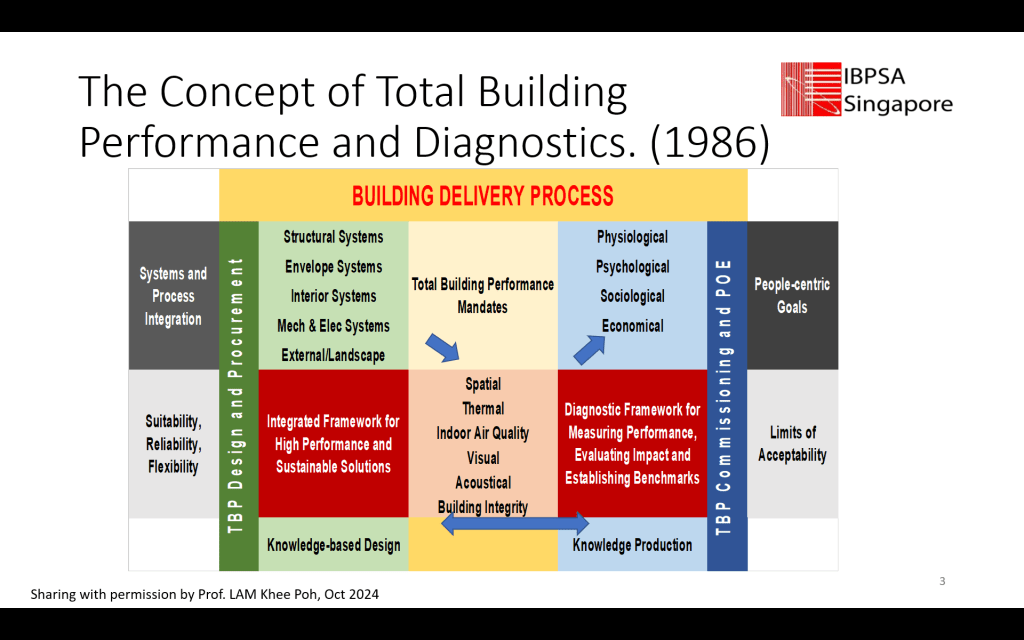 The committee also invited IBPSA Fellow, Prof. Lam Khee Poh to share IBPSA World background and formation. He was recently invited to Building Simulation 2023 Conference as keynote speaker. Through his sharing, we came to know that IBPSA World was formed at about the same time of Total Building Performance & Diagnostic (TBPD) concept was conceived in 1986. See Figure Below.